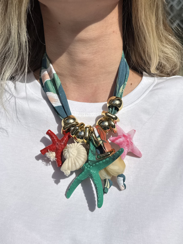De Ariel ketting geeft je meteen dat heerlijke zomergevoel. Met de speelse schelpen en zeesterren lijkt het alsof je een stukje strand met je meedraagt. De gouden details en de band met luipaard print maken het helemaal af en zorgen voor een unieke, opvallende look.