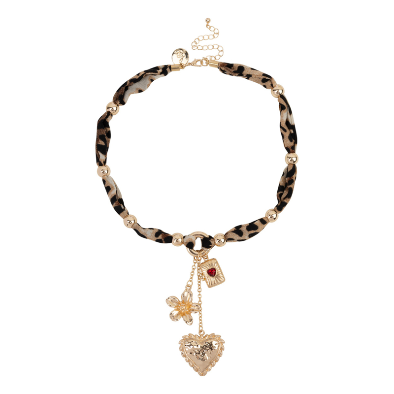 De speelse leopard print gecombineerd met glanzende gouden kralen geeft een krachtige en stijlvolle uitstraling. De bedels β een verfijnd hart, een bloem en een subtiel detail met een rood steentje β zorgen voor een charmante, vrouwelijke touch met een vleugje vintage flair.