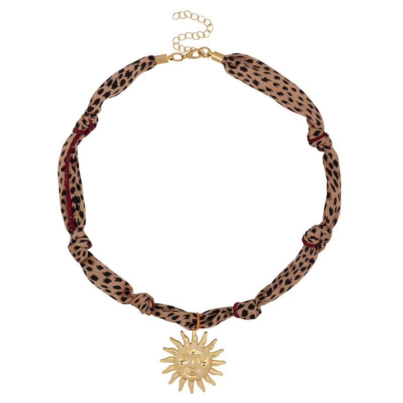 De leopard print stof geeft een speelse, trendy uitstraling, terwijl de goudkleurige zon hanger zorgt voor een krachtige en opvallende touch. De knoopdetails en subtiele rode accenten maken het ontwerp extra uniek en geven de ketting een nonchalante, fashionable vibe.