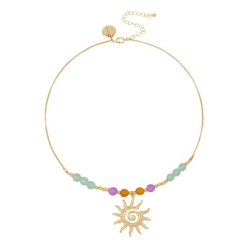 De combinatie van kleurrijke kralen en de opvallende zonhanger zorgt voor een frisse, trendy uitstraling — perfect om je look net dat beetje extra te geven.