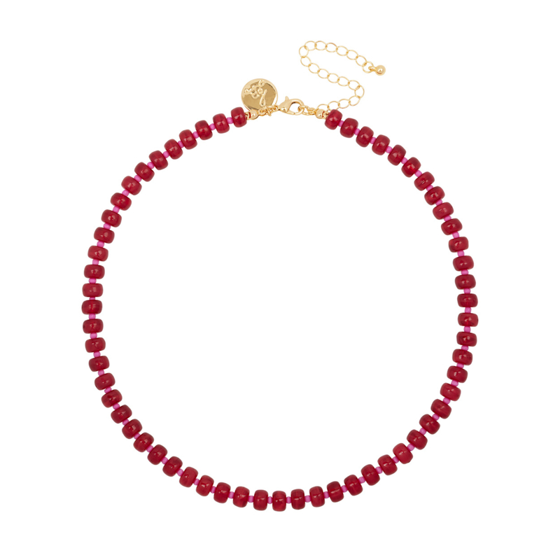 De glanzende dieprode kralen worden verfijnd afgewisseld met zachte roze accenten, wat zorgt voor een harmonieus en stijlvol geheel.