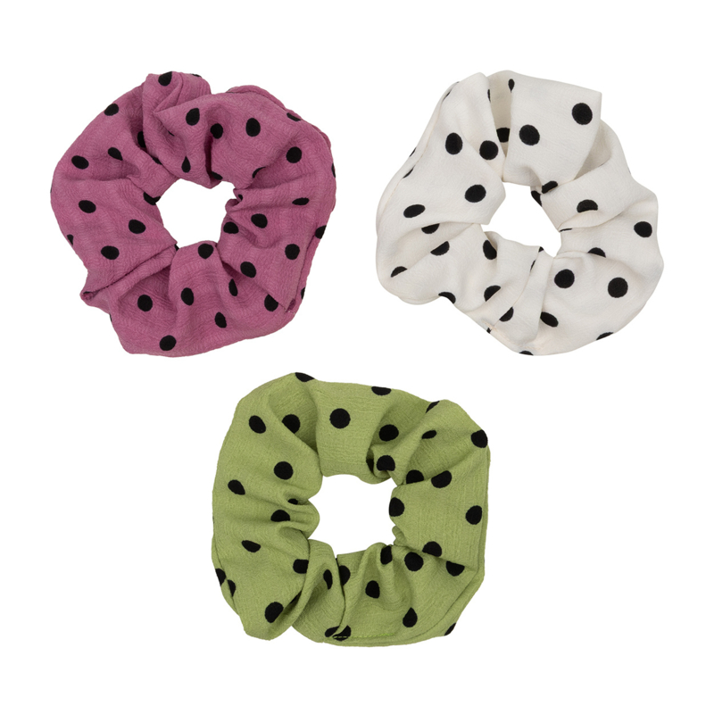 Deze scrunchies maken je look meteen vrolijk. De speelse stippen en frisse kleuren geven net dat beetje extra aan je haar.